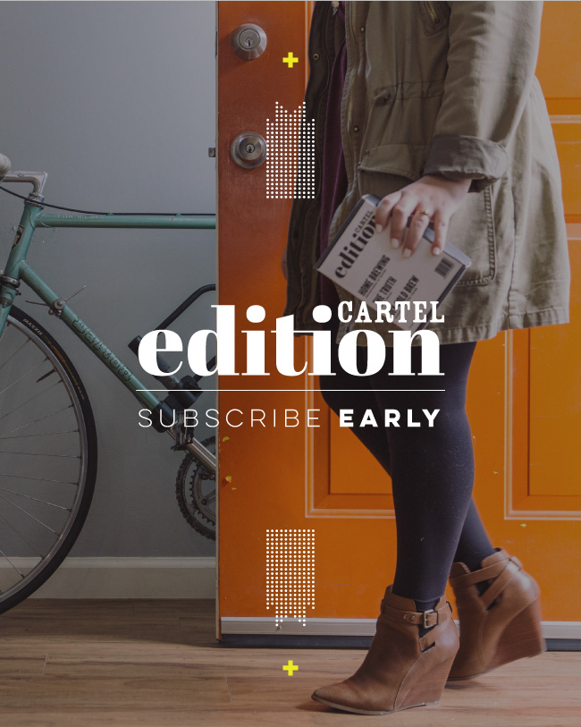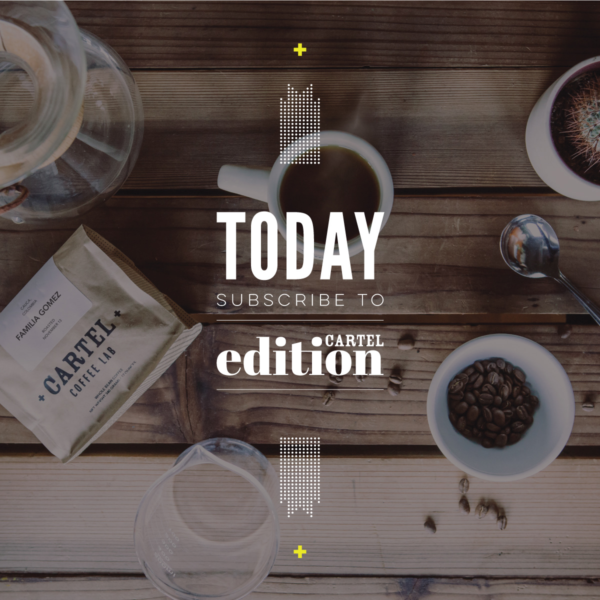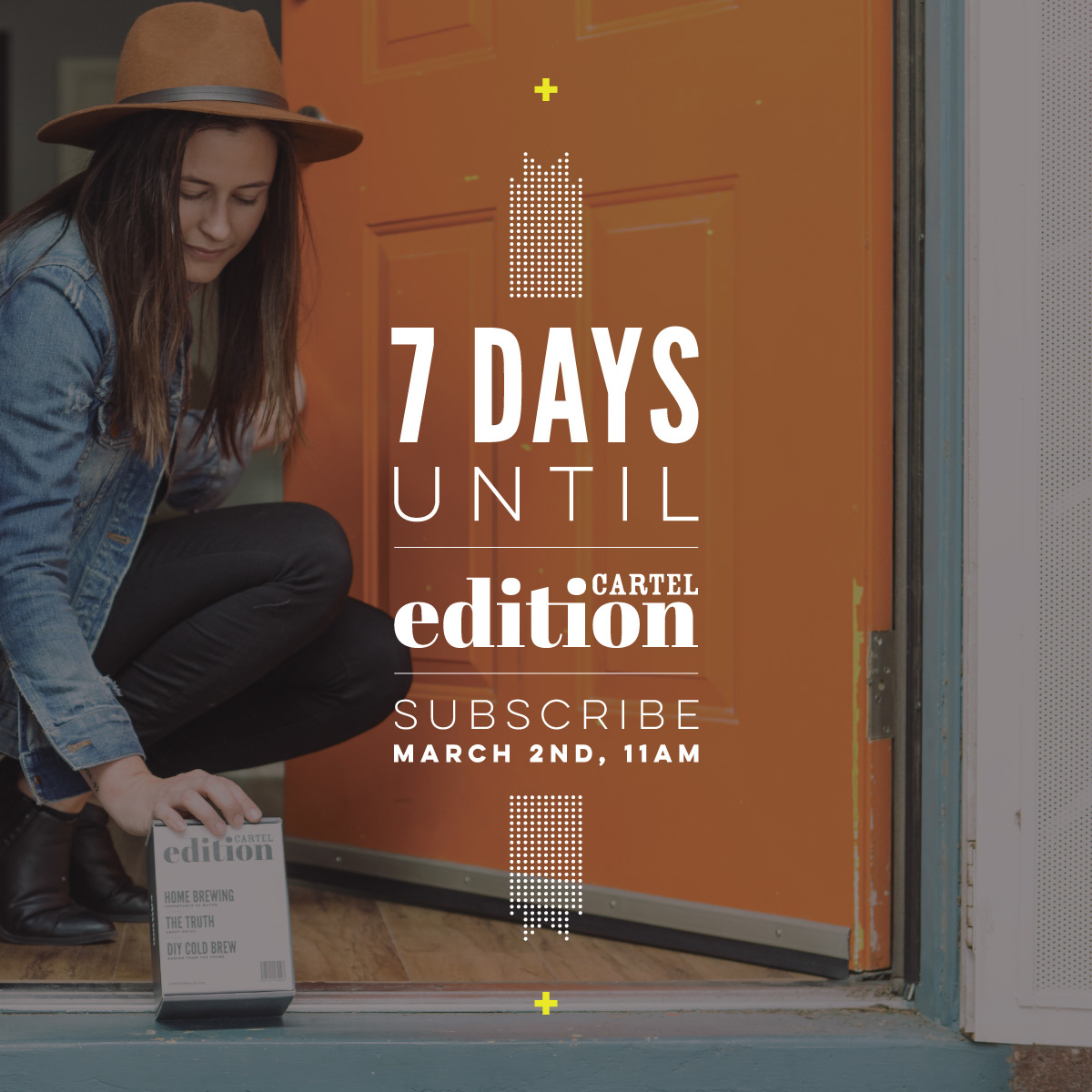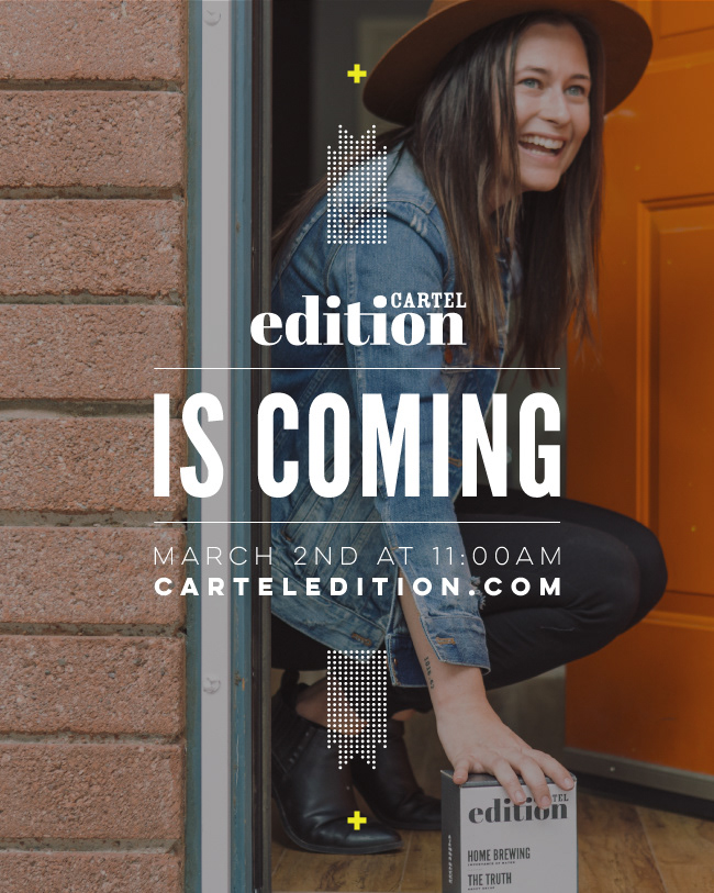 Cartel Edition is a brand new coffee subscription model from Cartel Roasting Co. While at AWE Collective, we had the opportunity to help create the packaging for what that would look like, a limited run of special promotional goods, market the campaign for it—teasing the product via social avenues with a countdown to the launch, and run email campaigns reminding Cartel lovers of the added benefits of delivering their coffee right to their door, all while pointing them to the Edition landing page to sign up.