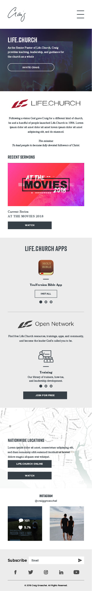 Craig Groeschel is the Senior Pastor of Life.Church, which is among the top 30 largest churches in the US, bringing in about 30,000 weekly visitors and ten times that number online at about 300,000 people each week. Craig and his wife, Amy, started Life.Church in a two-car garage in Edmond, Oklahoma in January 1996. Since then, Life.Church has grown to include dozens of locations all over the United States but its mission statement remains the same: to lead people to become fully devoted followers of Christ. Life.Church has become known for its innovative use of technology to spread the Gospel, launching the first fully digital church experience in 2006 and the most downloaded mobile Bible app in history, YouVersion, in 2008. Craig speaks at conferences around the world, has written several books including his latest release, Hope In The Dark: Believing God is Good When Life Is Not, and hosts the Craig Groeschel Leadership Podcast. The project consisted of UX design for the web flow and ultimately redesigning the old website which speaks to Craig and all of the different sides of what he's done and aims to accomplish. Work completed while at Sandoval.
